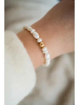 Bransoletka GOLDEN QUEEN jest wykonany z różnych rodzajów pereł. Tworzy komplet z naszyjnikiem GOLD QUEEN. Blasku nadaje jej gnieciona kulka z pozłacanego srebra.