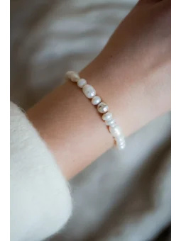 Bransoletka SILVER QUEEN jest wykonana z różnych rodzajów pereł. Tworzy komplet z naszyjnikiem SILVER QUEEN. Blasku nadaje jej gnieciona kulka ze srebra.