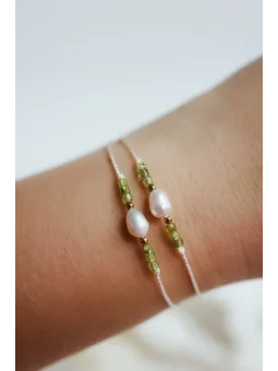 Bransoletka wykonana z oliwinu o wielkości około 2 mm, naturalna perła słodkowodna hodowlana o wielkości około 4 - 6 mm, hematyt o wielkości 2 mm, jedwabny sznurek.