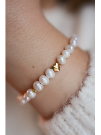 Bransoletka z pereł z sercem ze złotego hematytu i przekładkami ze srebra pozłacanego.