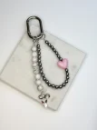 Brelok wykonany z hematytu o wielkości około 6 mm oraz howlitu około 10 mm, zapięcie, kółka oraz zawieszka ze stali nierdzewnej w kolorze srebrnym, zaciski wykonane ze srebra, stalowa linka o grubości 0,4 mm, przekładka w postaci serca z akrylu.
