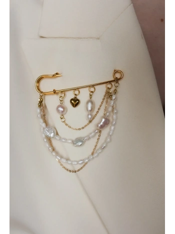 Broszka wykonana z pereł hodowanych o różnych wielkości około 3 - 10 mm, łańcuch, zaciski i kółka wykonane są ze stali nierdzewnej w kolorze złotym, broszka wykonana ze stopu metalu, stalowa linka o grubości 0,3 mm.