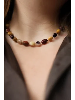 Naszyjnik idealny na jesień. Przepiękny kamień mokait, który posiada całą gamę jesiennych barw od burgundowego, przez brązy, aż do ciepłych oliwkowych zieleni i miodowej żółci.