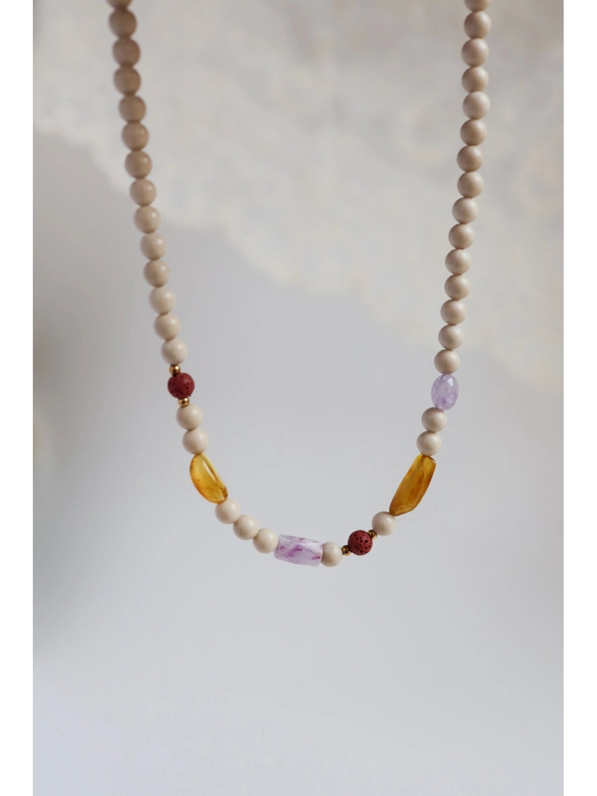 Naszyjnik z beżowych kamieni rzecznych z lawą wulkaniczną, bursztynem, ametystem i kunzytem.