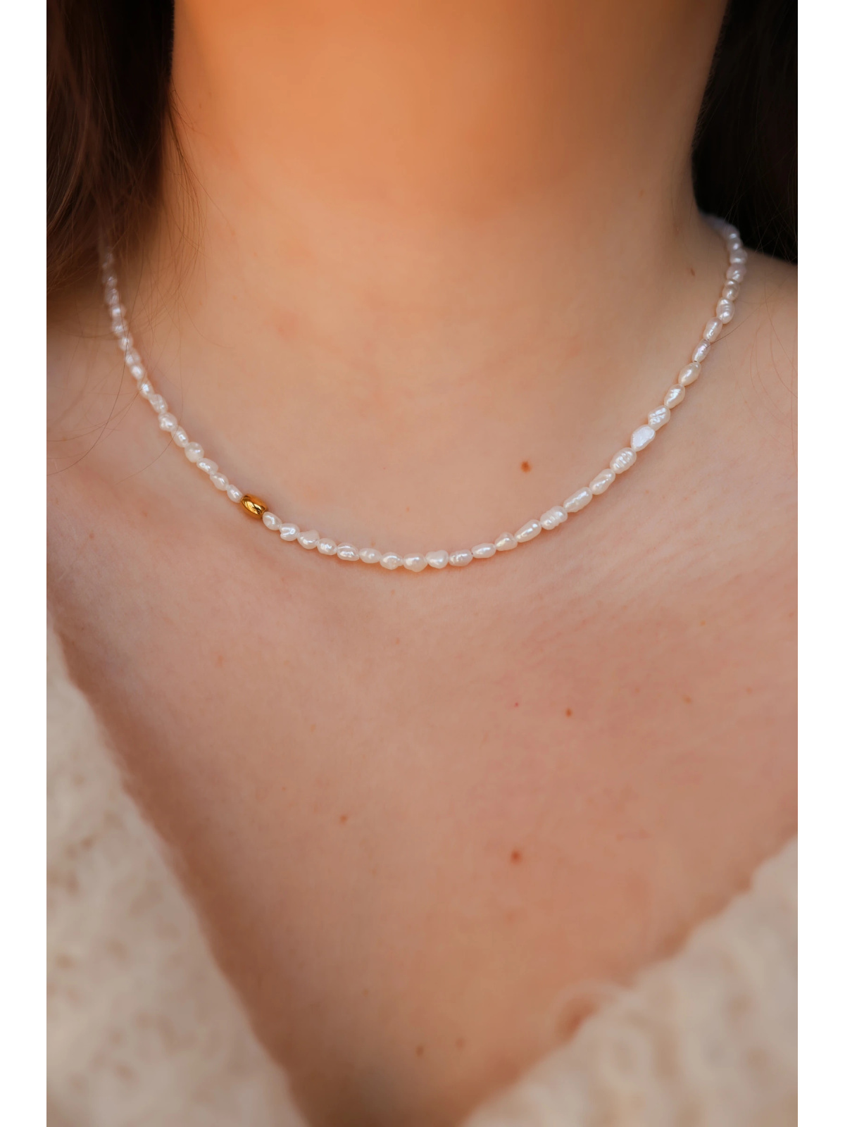 Delikatny i subtelny naszyjnik z malutkich pereł z przekładką ze złotego hematytu.