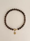 Naszyjnik wykonany z kwarcu dymnego o wielkości około 12 mm oraz brązowych koralików Toho, ozdobne zapięcie ze stali nierdzewnej, zawieszka ze stali nierdzewnej z cyrkonią, zaciski oraz kółka wykonane z pozłacanego srebra, stalowa linka o grubości 0,4 mm.