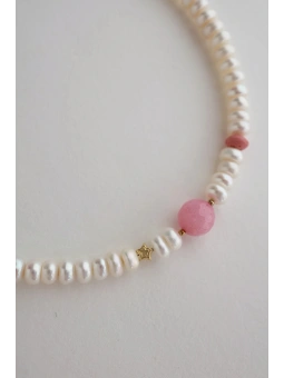 Naszyjnik wykonany z pereł słodkowodnych hodowlanych o wielkości około 8 x 5 mm, hematytu 2 mm, jadeitu około 12 mm, lawy wulkanicznej wielkości około 8mm, zapięcie, przedłużka 5 cm wykonane ze stali nierdzewnej, zaciski, przekładka oraz kółka wykonane z pozłacanego srebra, stalowa linka o grubości 0,4 mm.
