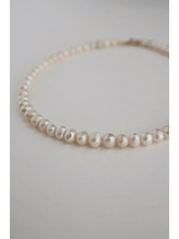 Naszyjnik wykonany z pereł hodowlanych słodkowodnych wielkości około 7 x 9 mm, zapięcie, przedłużka 4 cm wykonane ze stali nierdzewnej, zaciski, przekładka oraz kółka wykonane z pozłacanego srebra, stalowa linka o grubości 0,4 mm.