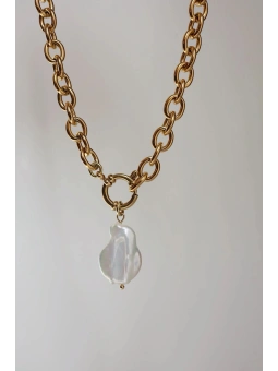 Naszyjnik wykonany z łańcucha ze stali chirurgicznej w kolorze złotym, oczka łańcucha o wielkości 10 x 8 mm, wisząca perła hodowlana, zapięcie ze stali nierdzewnej, kółka wykonane ze srebra pozłacanego.