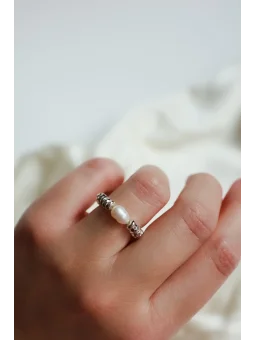 Elastyczny pierścionek ze srebrnego hematytu z perłą naturalną.