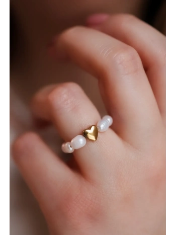 Elastyczny pierścionek z pereł ze złotym sercem | Upiększaj