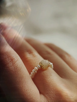 Pierścionek z naturalnych pereł słodkowodnych hodowlanych o wielkości 3 - 4 mm z przekładkami z pozłacanego srebra 925 i kamieniem cytrynu o wielkości 6 mm, elastyczna żyłka grubości 0,4 mm.